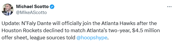 旺财28官网火箭拒绝匹配报价,因此当特将正式加盟老鹰,随后老鹰官宣签下当特,并且晒海报欢迎当特来到亚特兰大;当特成为NBA历史第一位以双向受限制自由球员的身份签下正式合同的球员。